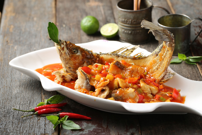 腌制過(guò)的鱸魚(yú)熱炸后澆上風(fēng)味獨(dú)特的三味醬汁,酸辣鮮香撲鼻而來(lái),聞到都讓人口水直流!