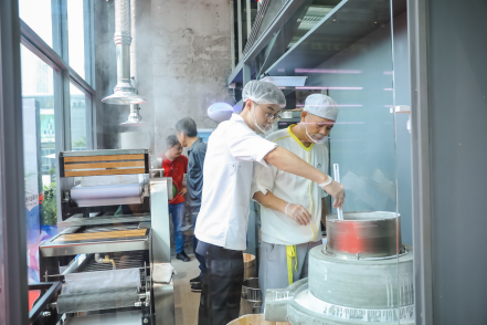一般的越南河粉店用的是進(jìn)口貨,就算來源再好,在運(yùn)輸過程中總有味道和韌度的流失。傳統(tǒng)河粉機(jī)屬于大型設(shè)備,蔡瀾團(tuán)隊(duì)經(jīng)過22個月的研發(fā)和改良,縮小尺寸才能將機(jī)器陳列于餐廳,讓顧客見證新鮮河粉生產(chǎn)制作的全過程:大米浸泡至軟,石磨磨成米漿再蒸熟、切割成河粉,用心打造出一碗新鮮美味的Pho。