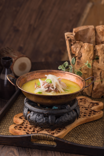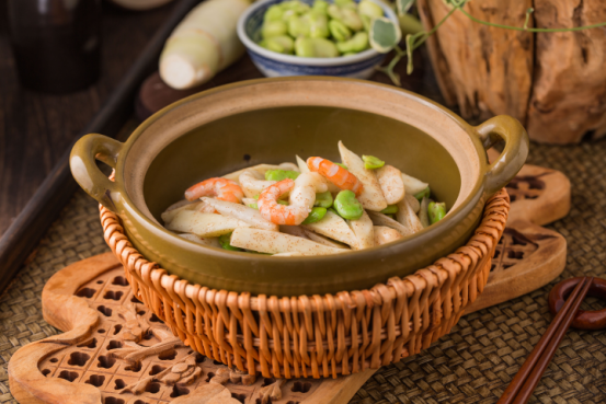 食材多來自水澤,藕帶、菱角、茭白、蠶豆瓣、大蝦仁,自制蝦醬爆炒起香,時蔬的白綠點綴蝦仁的淡粉,如青荷托芙蓉之色,砂鍋盛上,滋滋作響,讓人眼前浮現出“蛙聲喧夏夜,魚影動荷塘”的畫面。