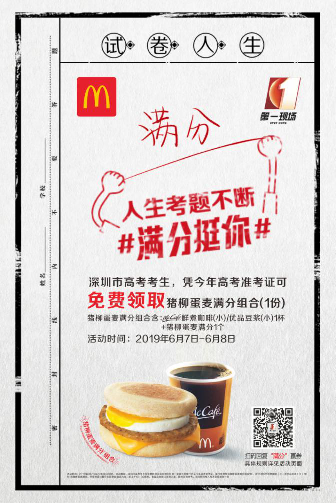 麥當(dāng)勞早餐攜手百萬(wàn)網(wǎng)友,預(yù)祝高考考生“滿分”考試,以“滿分”的早餐,迎接每天“滿分”生活。