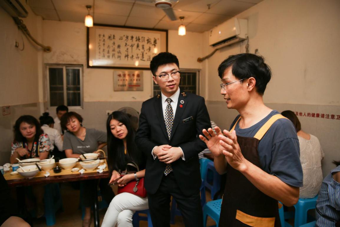 在禮賓司的引領(lǐng)下,大家來到已有千年歷史的文化遺產(chǎn)——南頭古城。一行人在“九街糖水鋪”入座,店主夫妻倆熱情的端出清甜可口的化州糖水和香氣四溢的潮州炒米粉,和我們嘮起了家長里短。大家方才得知,這宛如尋常百姓家的糖水鋪竟開業(yè)于1995年,見證了古城九街的變遷翻新和故去新來的幾代人潮川流。帶著傳播化州糖水美名初衷的糖水世家選擇在深圳發(fā)家,傳到這已是第三代。眾人大快朵頤,禮賓司也幫忙跑堂添茶。
