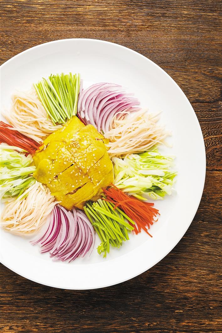 “撈”在粵語(yǔ)中有工作有錢賺的意思,祝愿來(lái)年風(fēng)生水起。徐師傅采用遠(yuǎn)近馳名的葵花雞。葵花雞顧名思義,由新鮮的葵花盤、葉、桿等炮制而成的飼料喂養(yǎng),以葵花桿榨成的汁解渴,是十足的“雞中貴族”。徐師傅選用講究的雞肉來(lái)準(zhǔn)備這道講究的菜,寓意前來(lái)用餐的賓客在來(lái)年可以步步高升、事事順利。將葵花雞、子姜絲、洋蔥絲、香菜段等各式新鮮食材撈到一起,齊齊起筷,高呼:“齊齊撈起,撈到風(fēng)生水起!”
