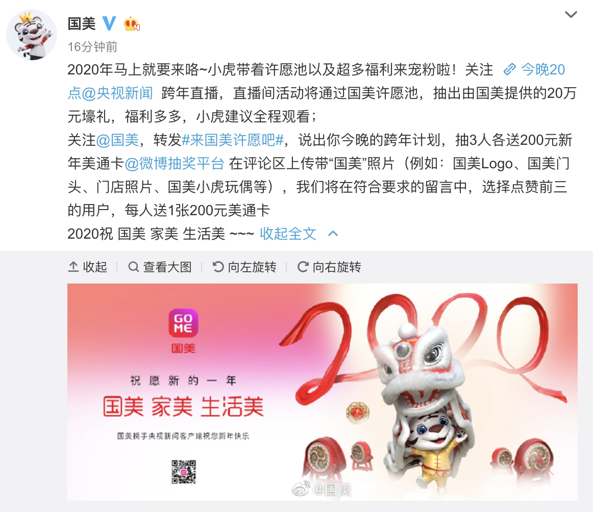 跨年就是要大聲說出你的心愿,趕快@國美幫你圓夢(mèng)?;顒?dòng)當(dāng)天,國美官方微博將與央視新聞同步抽獎(jiǎng),2019年12月31日17點(diǎn)起至2020年1月1日不同時(shí)間段抽取多項(xiàng)大獎(jiǎng),其中最高獎(jiǎng)項(xiàng)為價(jià)值2020元國美美通卡1張。