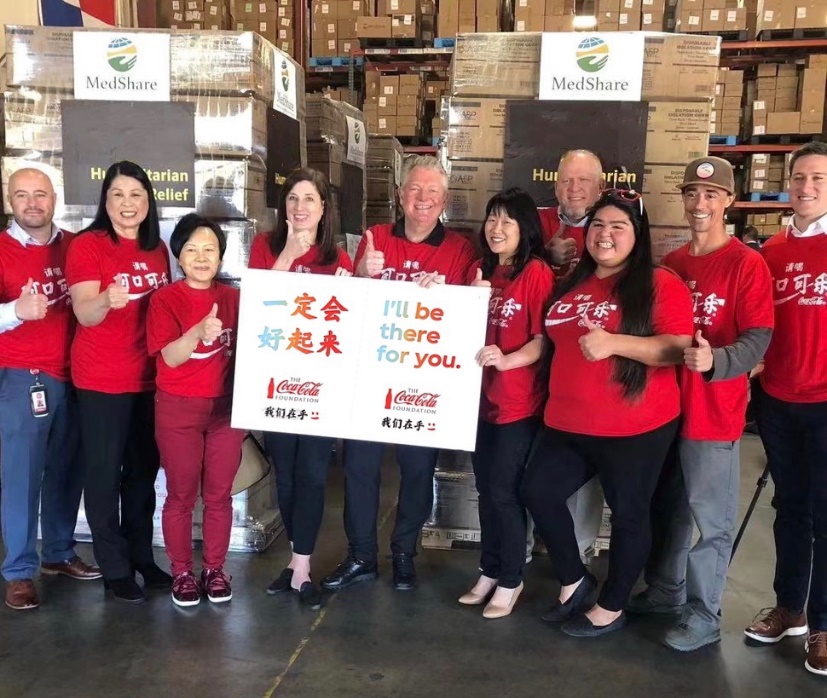 可口可樂(lè)中國(guó)及韓國(guó)區(qū)總裁馮廣晟(左五)與可口可樂(lè)公司及裝瓶合作伙伴的志愿者出席了在MedShare總部的物資啟運(yùn)儀式
