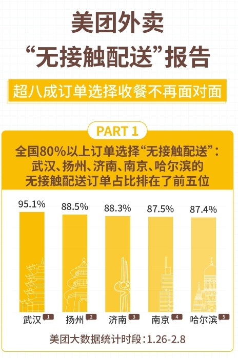 報告顯示,在1月26日至2月8日期間,在使用“無接觸配送”服務(wù)占比最高的城市中,武漢、揚(yáng)州、濟(jì)南、南京、哈爾濱排在了前五位。從用餐人數(shù)來看,2人份及以上餐食占總體訂單的比例相比較平時增長了31.7%。采用“無接觸配送”的訂單占到了整體單量的80%以上,且每一單外賣都使用“無接觸配送”服務(wù)的用戶占到66%。