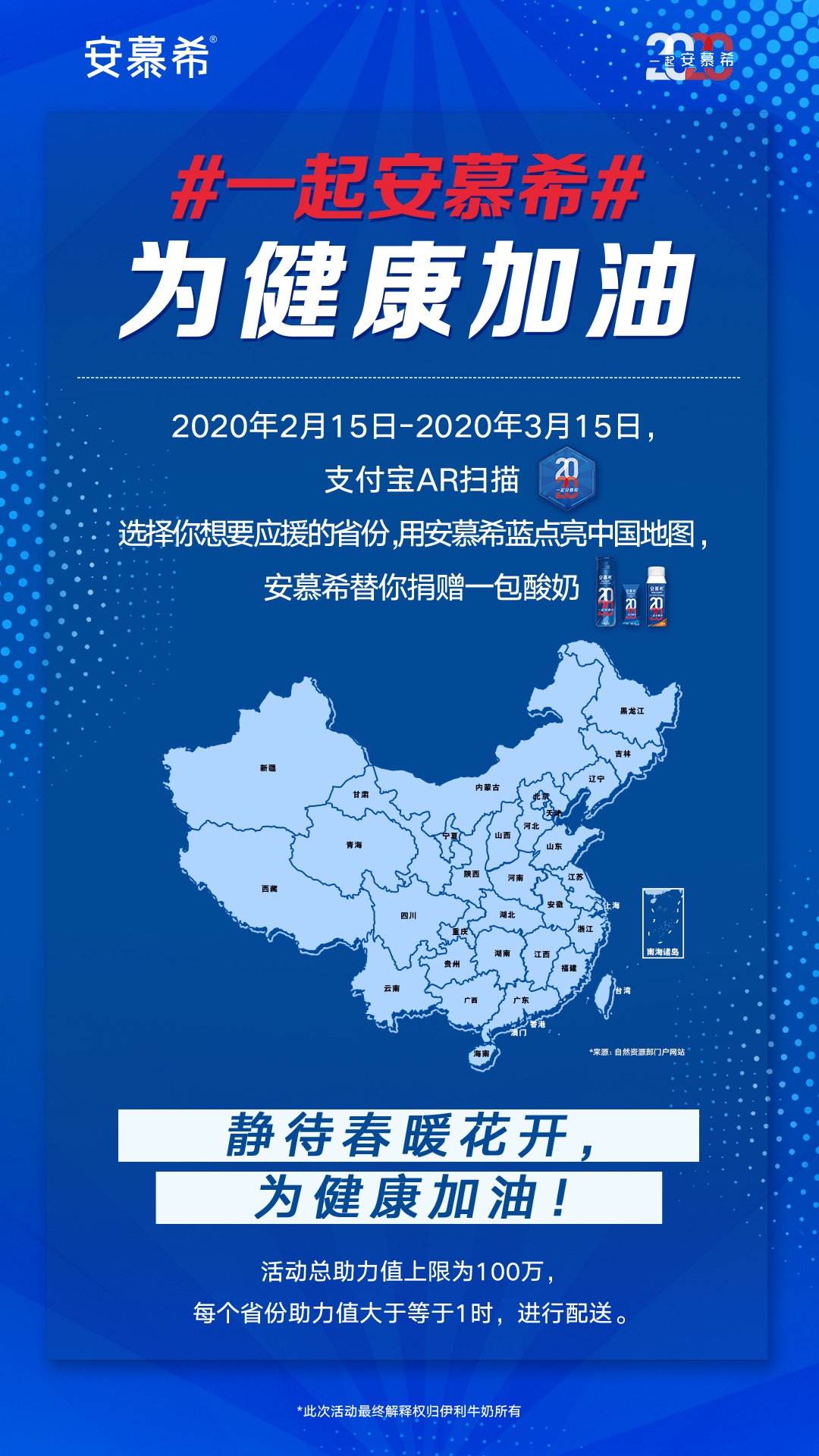 從2月15日起,安慕希發(fā)起“一起為健康加油”公益活動。消費者每成功通過支付寶AR掃描安慕希2020標(biāo)志,并為支持的地區(qū)點藍(lán),安慕希就會為抗疫一線人員送出安慕希產(chǎn)品,將愛心化為實際行動,為戰(zhàn)疫一線加油。