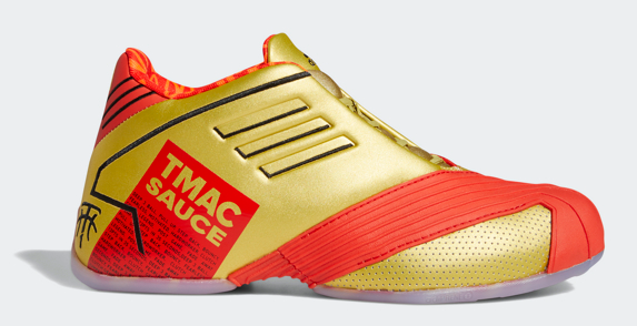 ? TMAC 1: 聯(lián)名款TMAC1采用金 屬色鞋面,搭配紅色細(xì)節(jié),外底綴金色拱門印花,致敬巨無霸醬——風(fēng)靡全球的巨無霸漢堡的獨(dú)特醬料。同時該鞋款也蘊(yùn)含麥蒂獨(dú)特“風(fēng)味配方”:干拔跳投、三分球、背身單打。