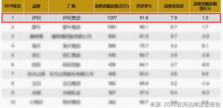 見圳客戶端·深圳新聞網(wǎng)2020年6月23日訊 日前,凱度消費者指數(shù)發(fā)布了《2020亞洲品牌足跡報告》。伊利憑借91.6%的品牌滲透率、近13億的消費者觸及數(shù)和近8次的購買頻次,連續(xù)五年位列中國市場消費者選擇最多的品牌榜首。綜合報告數(shù)據(jù)顯示,伊利各項指標(biāo)在榜單中領(lǐng)先于其他品牌,持續(xù)領(lǐng)跑中國快消品市場。