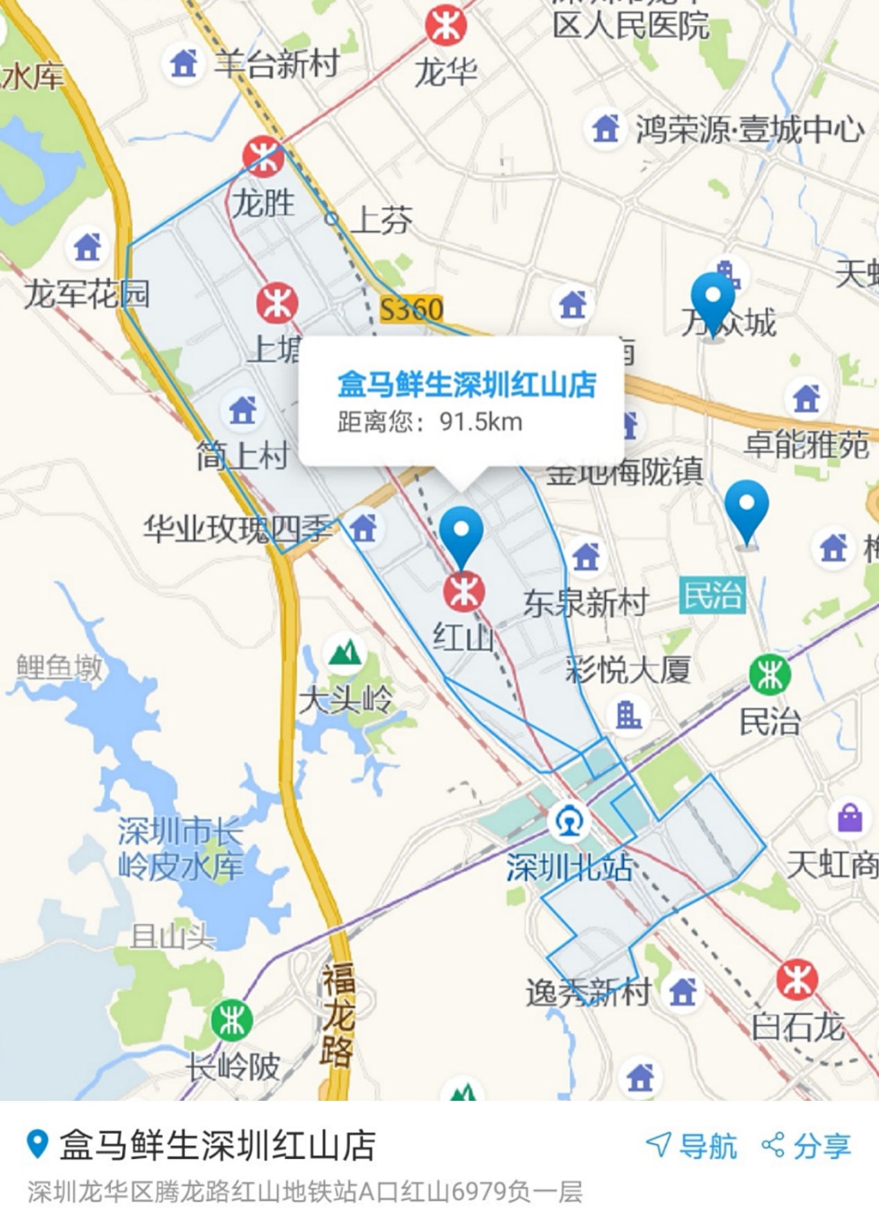 盒馬紅山店的“盒區(qū)房”覆蓋廣深港高鐵沿線,北至龍華區(qū)和平路,南至民豐路,橫跨三個地鐵站,而深圳最大的高鐵站深圳北站(外廣場)也在盒區(qū)范圍內(nèi)。大數(shù)據(jù)中心監(jiān)測,深圳北站商圈內(nèi)居住人口達到了30.8萬人,工作日客流約75.77萬人。