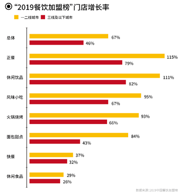 據(jù)“2019中國(guó)餐飲加盟榜”發(fā)布的數(shù)據(jù)顯示,2019年上榜的100家加盟品牌中,在一二線城市,百大上榜品牌門店數(shù)的增長(zhǎng)率平均值為67%,顯著高于中國(guó)餐飲連鎖品牌整體增長(zhǎng)率;在三線及以下城市,百大上榜品牌門店數(shù)的增長(zhǎng)率平均值為46%。正餐與休閑飲品兩大品類在一二線城市城市門店數(shù)的增長(zhǎng)率更是超過了100%。