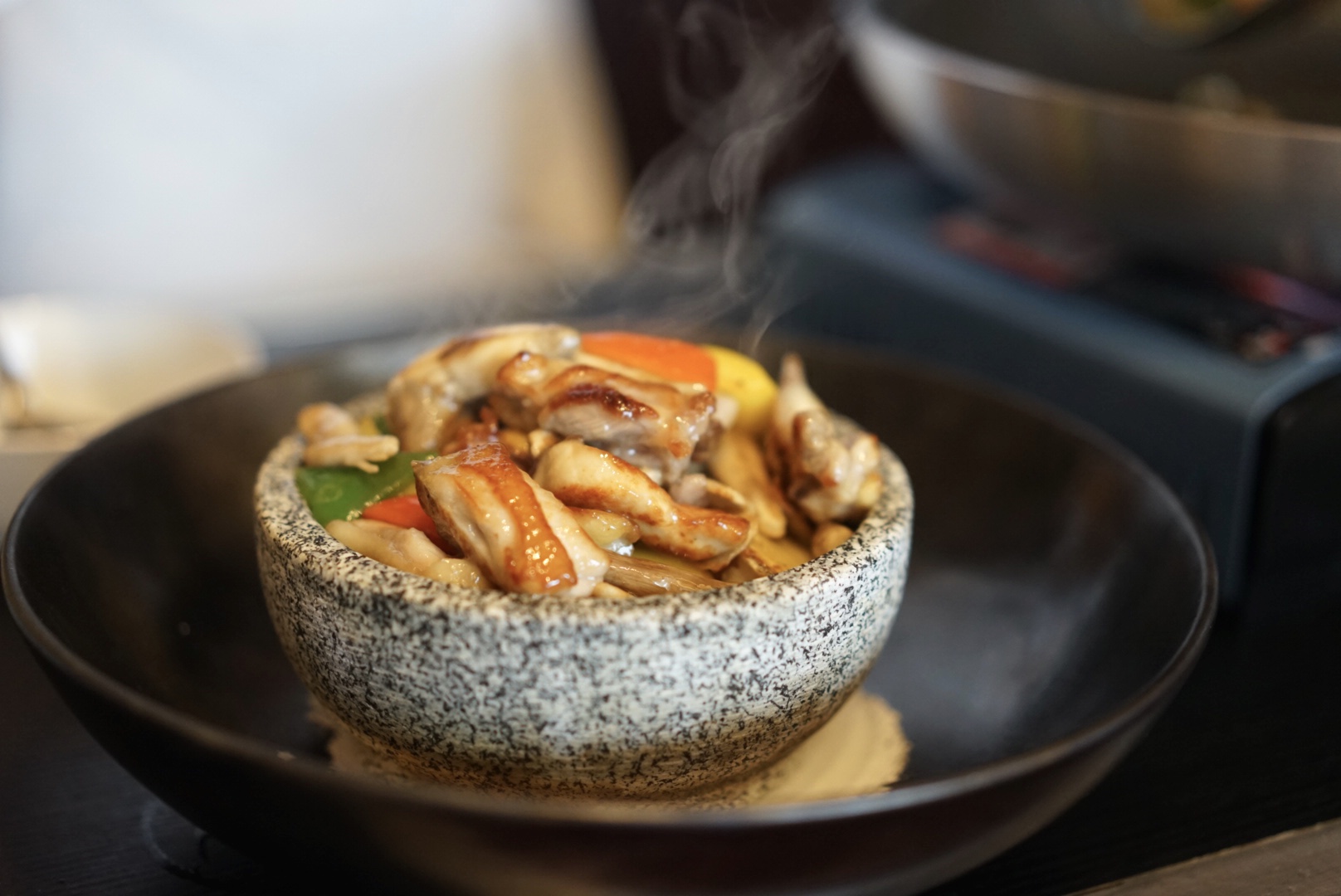 5、準(zhǔn)備一石鍋,放入燒熱的蒜粒與紅蔥頭,再將青紅椒、雞樅菌和雞肉等倒入石鍋之中,即可。