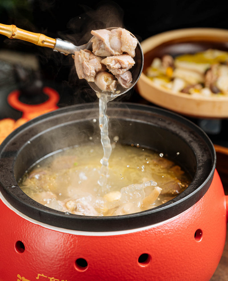 以雞為主要烹飪食材,洞庭土雞館的湖南師傅創(chuàng)造出了不一樣的菜肴。每桌食客坐下,都少不得一碗暖乎乎的洞庭土雞湯來“開場(chǎng)”。它的登場(chǎng)也相當(dāng)有氣勢(shì),長(zhǎng)沙紅磚窯特別定制的大湯鍋,內(nèi)膽是紫砂構(gòu)造,這樣的設(shè)計(jì)既是出于美觀,又是出于更長(zhǎng)時(shí)間更有效保溫的效果。俗話說得好,工欲善其事必先利其器。土雞方面,師傅特別精選了湖南竹山雞,肉質(zhì)的彈性略勝一籌,據(jù)介紹,竹山雞的養(yǎng)殖戶開放了大片山頭讓雞跑,放養(yǎng)時(shí)間足夠長(zhǎng),達(dá)到一年多,在如今快節(jié)奏的社會(huì)里已實(shí)屬難得。老雞加山泉水文火熬3個(gè)小時(shí),并沒有其他的味道干擾,簡(jiǎn)簡(jiǎn)單單就是本味。