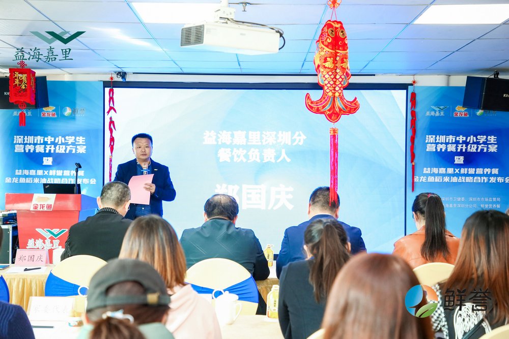 會議開場由益海嘉里深圳分餐飲負責人鄭國慶先生介紹益海嘉里的歷程并對鮮譽營養(yǎng)餐出品表示肯定,隨后鮮譽總經(jīng)理嚴資旺先生敘述了在營養(yǎng)餐升級過程中的努力,通過營養(yǎng)師和專業(yè)博士對營養(yǎng)餐數(shù)據(jù)和內(nèi)容的講述,讓在座的家委代表們更加了解了營養(yǎng)餐升級的必要性和可行性。益海嘉里稻米油項目的張波先生和朱若維女士以視頻的方式講述了金龍魚稻米油的來源以及榮譽,目前金龍魚稻米油已經(jīng)在日本上市多年并作為中小學生指定用油長期使用。此外,發(fā)布會現(xiàn)場還舉行了益海嘉里與鮮譽戰(zhàn)略合作的授牌及剪彩儀式。
