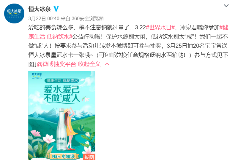 見圳客戶端·深圳新聞網(wǎng)2021年3月30日訊 (記者 常軍平)目前正值3月22日第二十九屆“世界水日”以及3月22—28日第三十四屆“中國(guó)水周”之際,恒大冰泉天然低鈉礦泉水深入洞察借勢(shì),發(fā)起以不做“咸”人為主題的公益活動(dòng),引發(fā)了全網(wǎng)的關(guān)注熱議和積極參與,刷屏社交媒體,成為新的公益“爆款”。