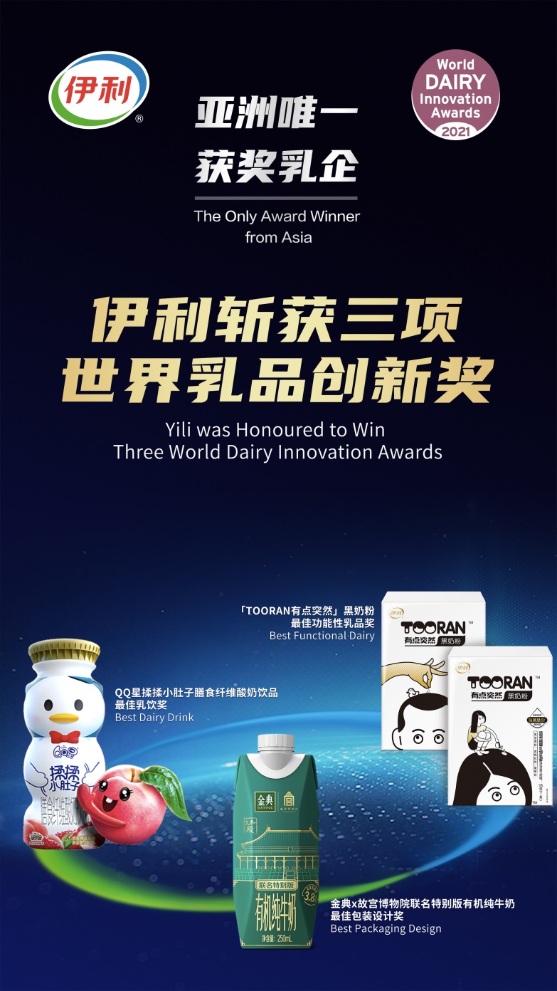 作為全球乳業(yè)的創(chuàng)新風向標,世界乳品創(chuàng)新獎展示了全球乳企在創(chuàng)新方面取得的重要成果,本屆共有來自25個國家、20個類別的222個作品參賽。憑借領先的創(chuàng)新實力,伊利旗下產(chǎn)品獲得三項大獎:QQ星揉揉小肚子膳食纖維酸奶飲品獲得最佳乳飲獎、「TOORAN有點突然」黑奶粉獲得最佳功能性乳品獎、金典x故宮博物院聯(lián)名特別版有機純牛奶獲得最佳包裝設計獎。