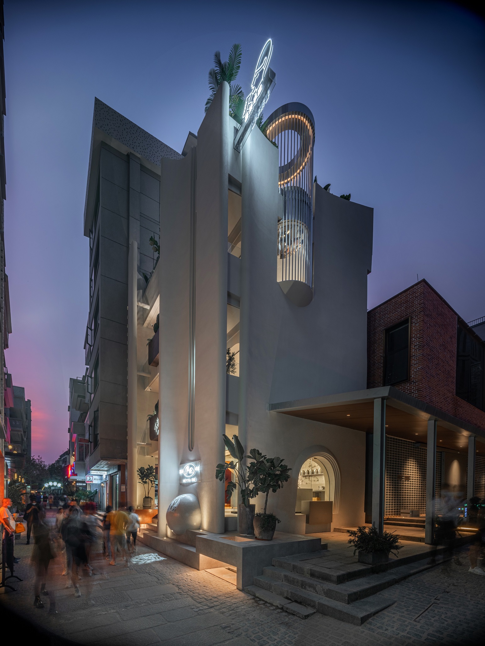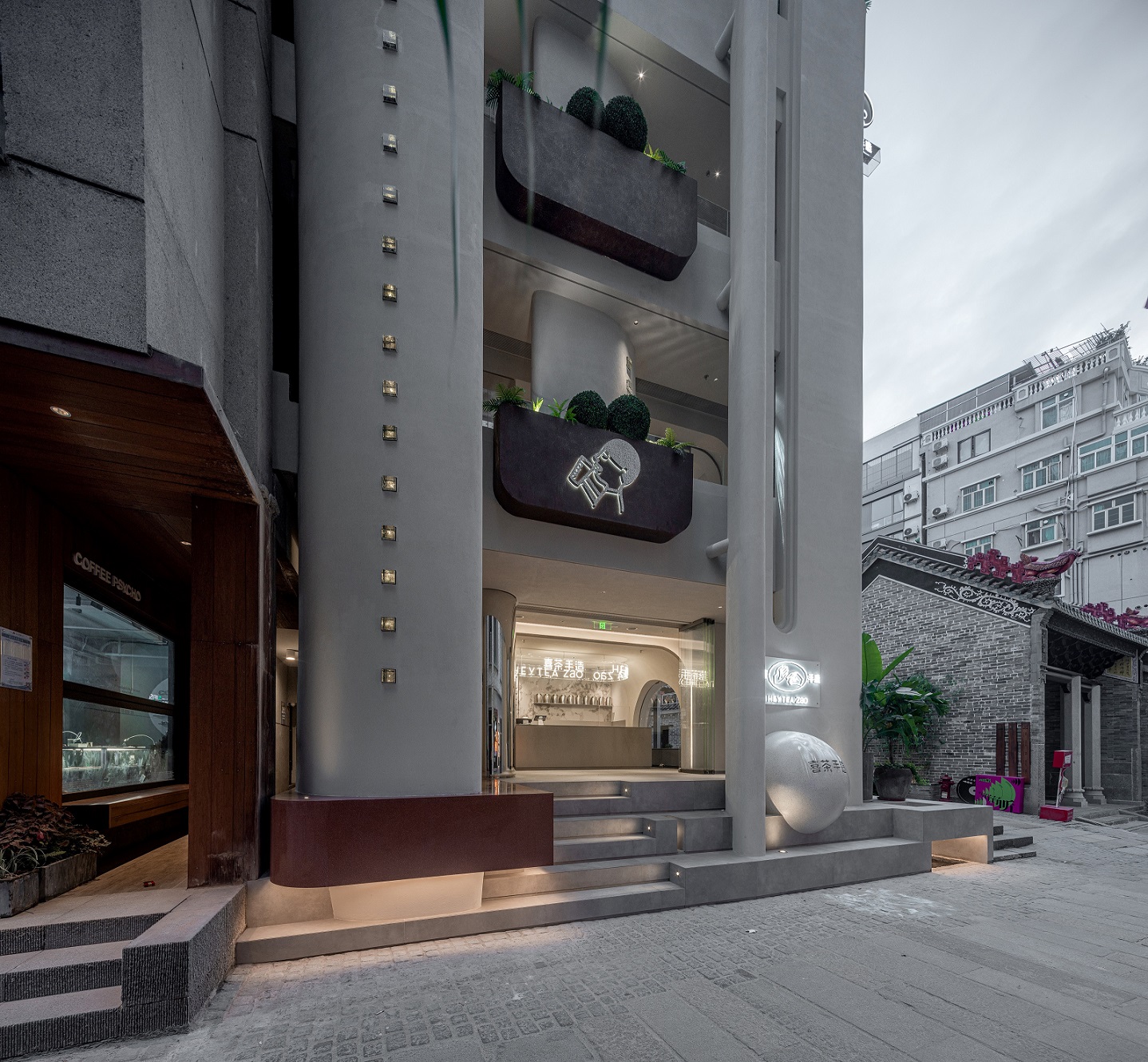 門店整體建筑設(shè)計(jì)是從幾何圖形中抽象出簡潔線條,改變原先外立面單一的線性結(jié)構(gòu),突破對(duì)于建筑形態(tài)的固有思維。外立面則選用水紋氣泡玻璃磚、做舊的復(fù)古外墻肌理漆,二、三樓陽臺(tái)花槽由銹鐵材質(zhì)制成,強(qiáng)調(diào)歷史感。同時(shí),整體建筑中有一道空凹槽,自上而下營造水流不息的視覺感、靈動(dòng)感,形成動(dòng)靜結(jié)合的整體樓面。
