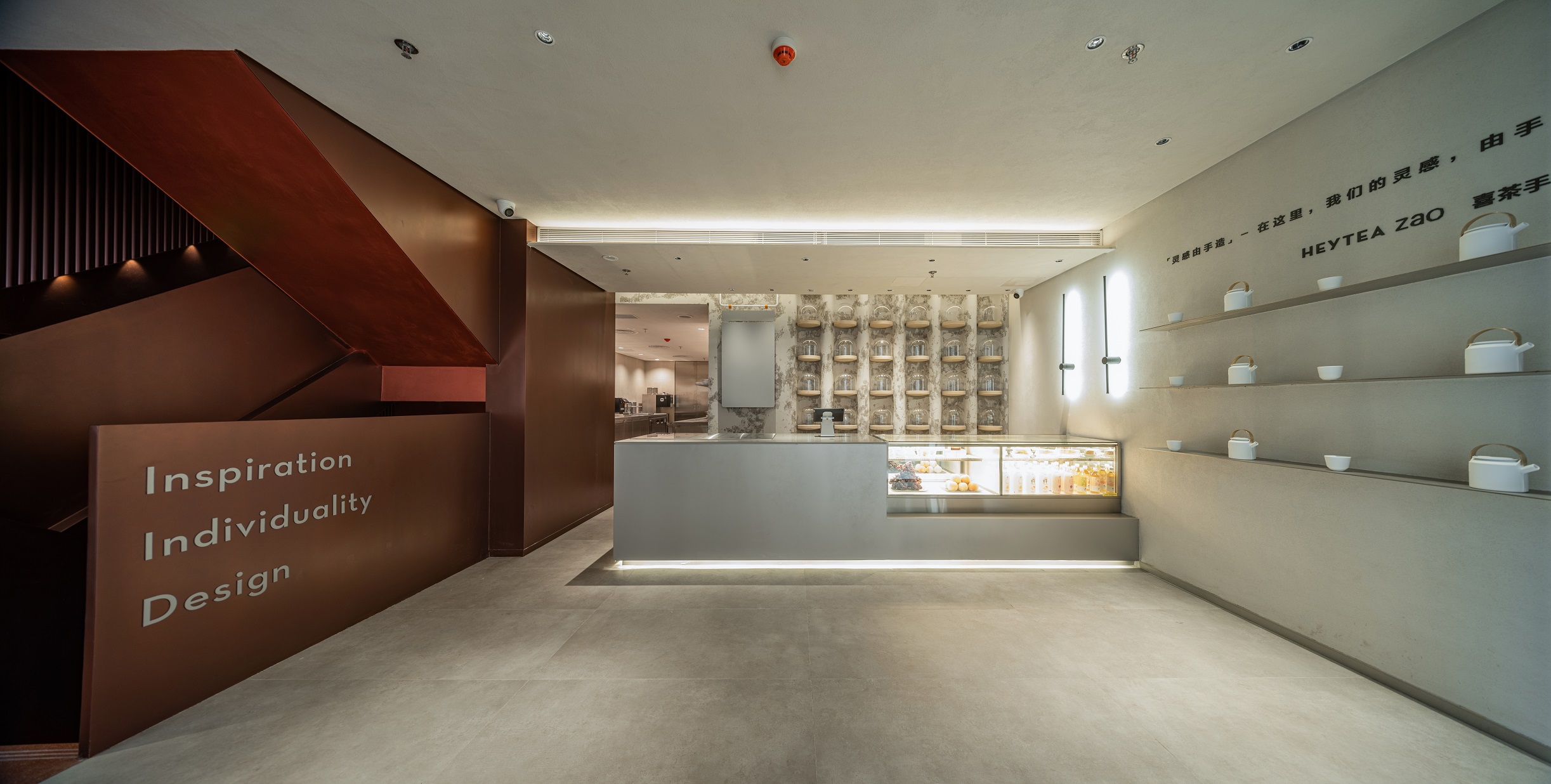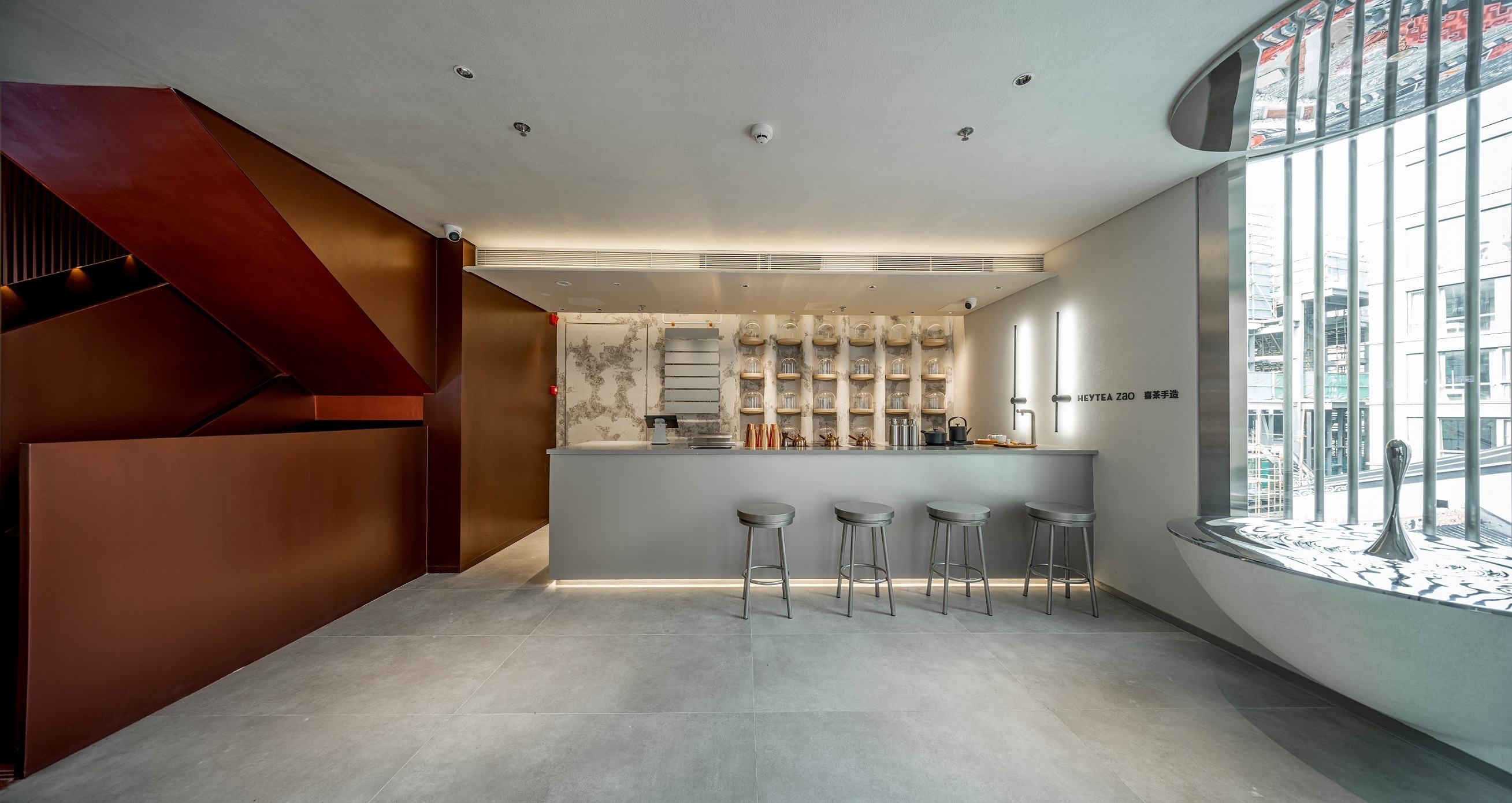 在內(nèi)部設(shè)計(jì)上,喜茶同樣以創(chuàng)新的功能空間設(shè)置和突破性設(shè)計(jì),呼應(yīng)每一樓層的手造主題,升級(jí)了消費(fèi)者的空間體驗(yàn)。喜茶將一樓正門墻體改造為玻璃移門,塑造出通透的門店空間;變封閉窗戶為開放的門,讓顧客看得見手造產(chǎn)品的全過程。此外,在用色與材質(zhì)搭配上,門店內(nèi)部整體采用嶺南復(fù)古紅與現(xiàn)代極簡白搭配,做舊復(fù)古肌理漆與現(xiàn)代化金屬材質(zhì)呼應(yīng),不僅有效進(jìn)行功能分區(qū),還體現(xiàn)歷史感與現(xiàn)代感的對(duì)比、融合。