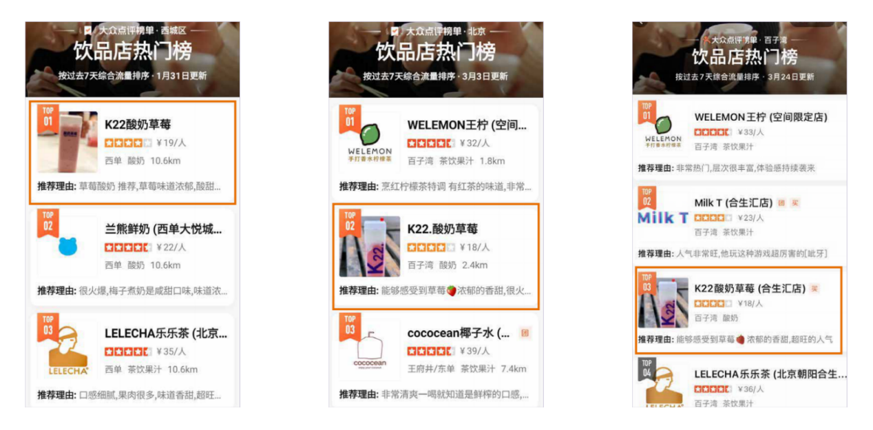 自帶流量的K22.酸奶草莓很快把店開(kāi)進(jìn)了北京一線商圈——西單大悅城,并在當(dāng)時(shí)火速登頂大眾點(diǎn)評(píng)西城區(qū)熱門榜 TOP1,成為當(dāng)之無(wú)愧的北京排隊(duì)王。