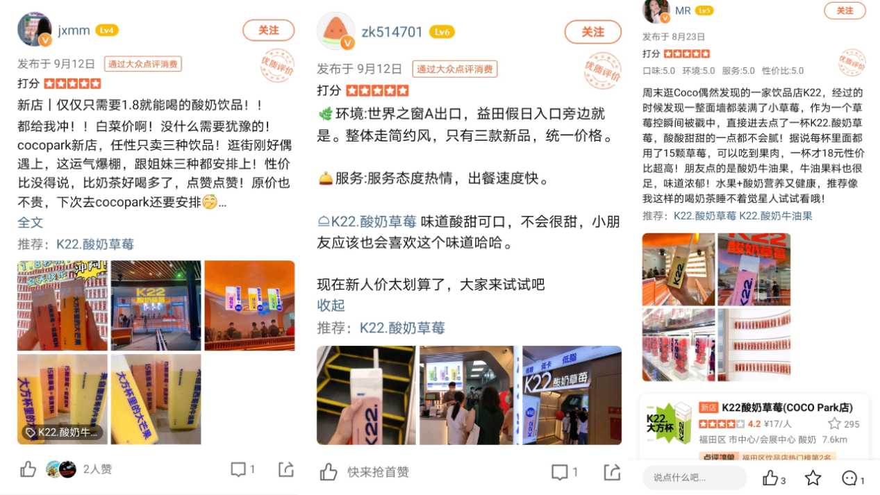 目前K22.酸奶草莓深圳門店已正式開(kāi)業(yè),試營(yíng)業(yè)期間已榮登大眾點(diǎn)評(píng)飲品熱門榜單并收獲了相當(dāng)不錯(cuò)的人氣和好評(píng),相信K22.酸奶草莓在深圳的市場(chǎng)發(fā)展一定能再創(chuàng)輝煌。