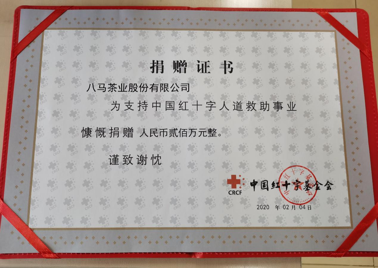 八馬茶業(yè)向中國紅十字基金會捐贈人民幣200萬元,用于支援新型冠狀病毒感染的肺炎疫情防控及防疫一線醫(yī)務人員發(fā)放人道救助金等工作。