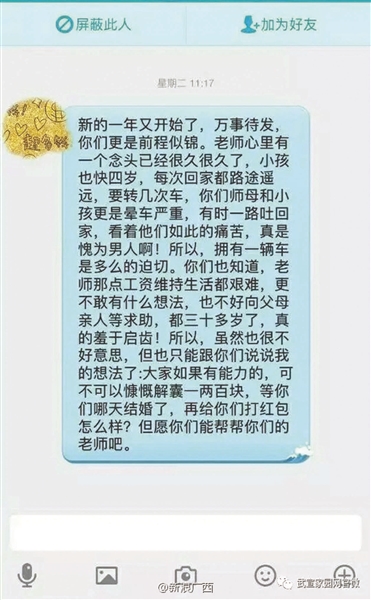 爆料帖中同時(shí)上傳了多張聊天記錄,其中一張顯示:“新的一年又開始了,萬事待發(fā),你們更是前程似錦。老師心里有個(gè)念頭已經(jīng)很久了,小孩也快四歲了,每次回家都路途遙遠(yuǎn),要轉(zhuǎn)幾次車,你們師母和小孩更是暈車嚴(yán)重,有時(shí)一路吐回家,看看他們?nèi)绱送纯啵媸抢槟腥税?!所以,擁有一輛車是多么的迫切。你們也知道老師那些工資維持生活都很艱難,更不敢有什么想法,也不好向父母親人求助,都三十多歲了,真的羞于啟齒!所以,雖然也很不好意思,但是也只能跟你們說說我的想法了:大家如果有能力的,可不可以慷慨解囊一兩百塊,等你們哪天結(jié)婚了,再給你們打紅包怎么樣?但愿你們能幫幫你們的老師吧。”