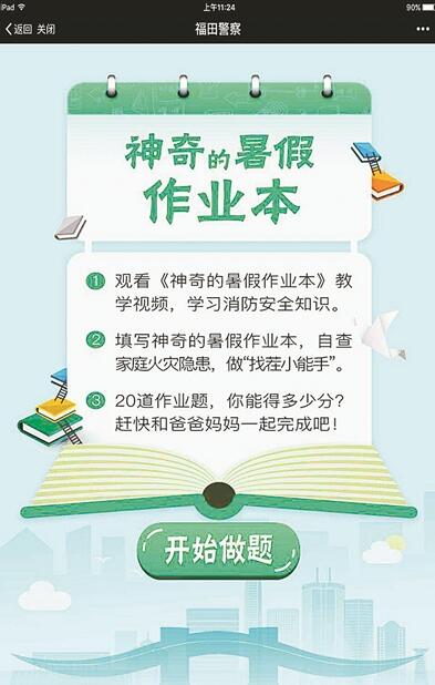 對于本學(xué)期這份特別的暑假消防作業(yè),上沙中學(xué)安全主任劉偉告訴記者,相比過去紙質(zhì)版消防安全宣傳冊更為形象和生動,能激發(fā)學(xué)生的學(xué)習(xí)興趣,里面的消防知識也更容易被學(xué)生所接受?!跋腊踩麄骶驮撨@樣,過去灌輸式的宣講,孩子不愛聽,老師講的也枯燥,這樣的形式把大家的積極性調(diào)動起來了,孩子們有了興趣才能在現(xiàn)實生活中學(xué)以致用?!眲フf,“我們特別重視安全教育,安全教育已經(jīng)成為我們學(xué)校學(xué)生的必修課。”據(jù)劉偉介紹,除了會給學(xué)生留一份假期家庭消防作業(yè)外,在每個學(xué)期的散學(xué)典禮上,學(xué)校法制副校長都會來到學(xué)校,給學(xué)生上一堂生動的法制安全教育課,通過豐富的案例,帶給學(xué)生假期內(nèi)消防、交通、人身等多方面的安全知識。同樣地,等假期結(jié)束,學(xué)生回到學(xué)校,也會安排安全教育作為開學(xué)的第一節(jié)課。