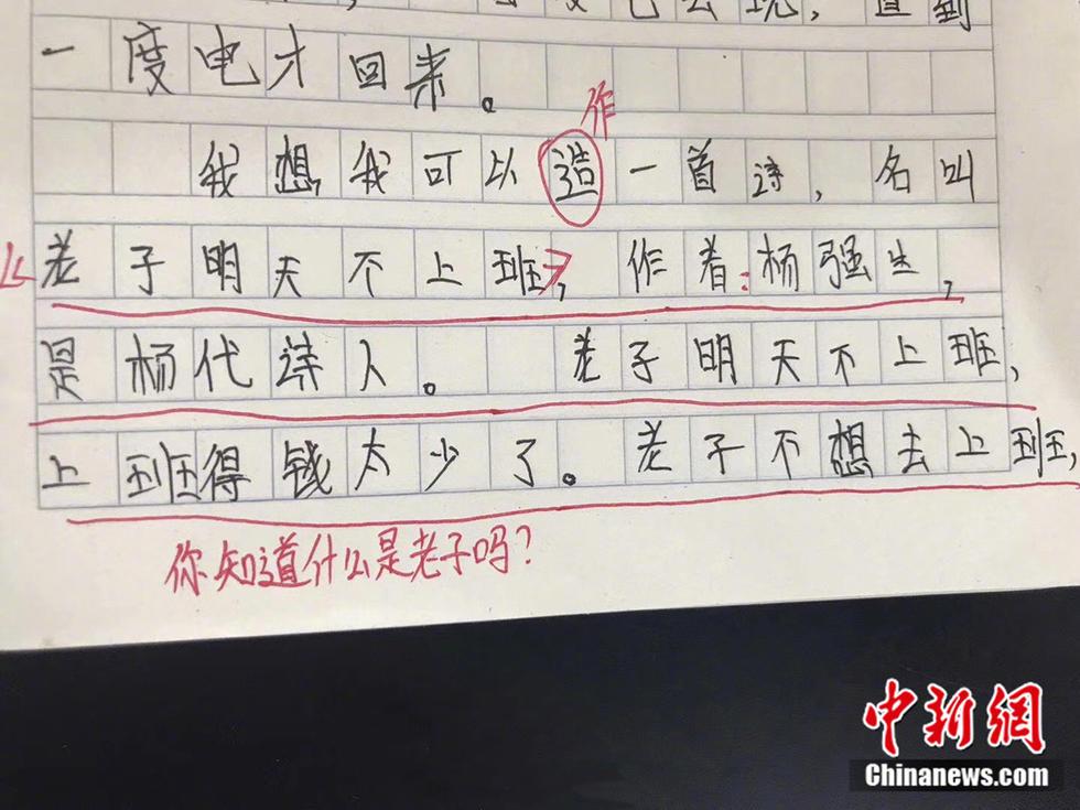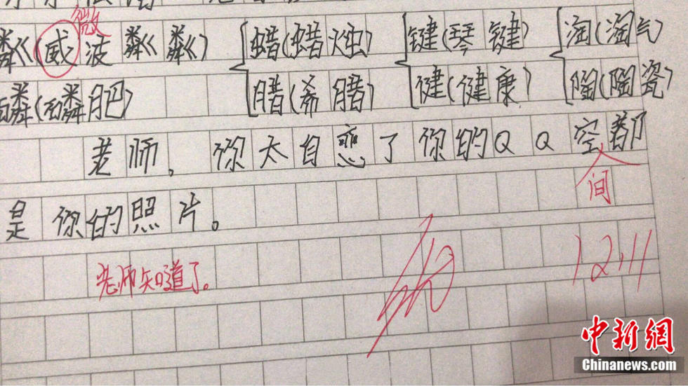 近日,貴州省谷隴翁板小學(xué)的語文老師張沁文,曬出了學(xué)生寫在作業(yè)里的“金句”?!袄蠋煟闾詰倭?,QQ空間都是自己照片”;“顏值升高才有人喜歡您”……孩子們的童言無忌令人哭笑不得,老師的評論也很亮眼。