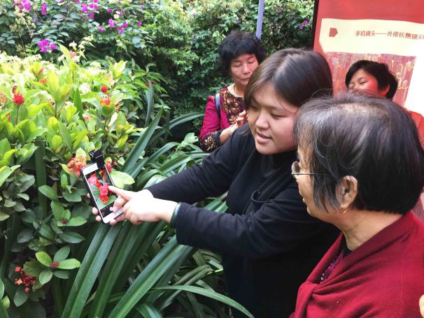 市民們在講解員指導(dǎo)下練習(xí)手機(jī)攝影