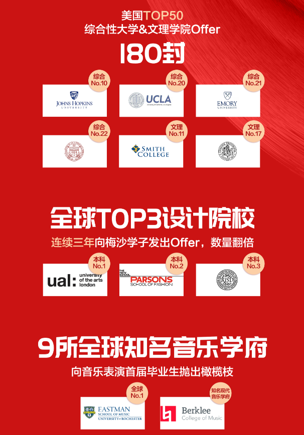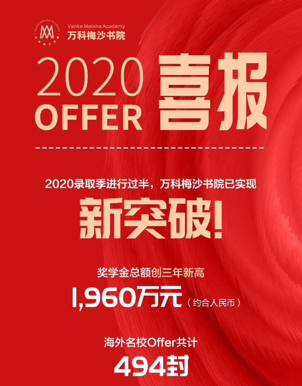 2020申請(qǐng)季還未結(jié)束,梅沙學(xué)子已收獲494封海外名校錄取Offer,獎(jiǎng)學(xué)金累計(jì)約合人民幣1,960萬(wàn)元,創(chuàng)三年新高。其中,來(lái)自美國(guó)Top100綜合性大學(xué)及文理學(xué)院的錄取通知書(shū)有356份,來(lái)自美國(guó)Top50綜合性大學(xué)及文理學(xué)院的錄取通知書(shū)有180份。