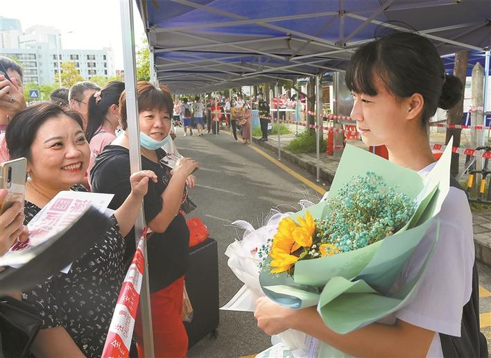 家長帶著鮮花來到寶安中學考場門口迎接考生。深圳商報記者陳錫明攝