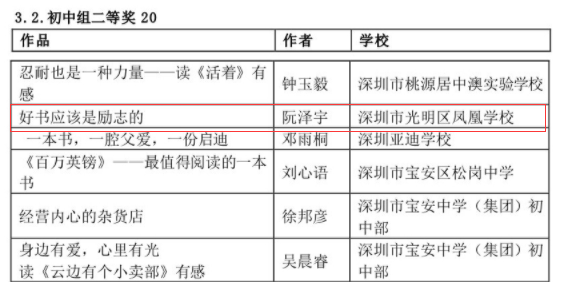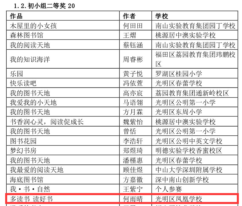 在深圳市4·23世界讀書日“探索閱讀新領(lǐng)域”創(chuàng)作比賽中學(xué)校榮獲優(yōu)秀組織獎(jiǎng),何雨晴、劉宥伯同學(xué)分別獲初小組二等獎(jiǎng)、三等獎(jiǎng);阮澤宇、張雪怡同學(xué)分別榮獲初中組二等獎(jiǎng)、三等獎(jiǎng)。郭瑞芳老師榮獲優(yōu)秀指導(dǎo)老師獎(jiǎng),曾嵽稜、賴美君、李海亮榮獲優(yōu)秀組織老師獎(jiǎng)。