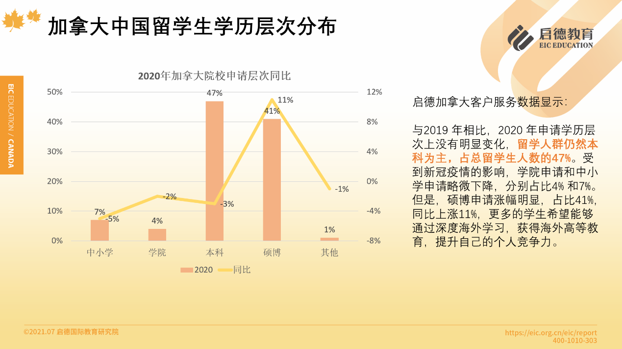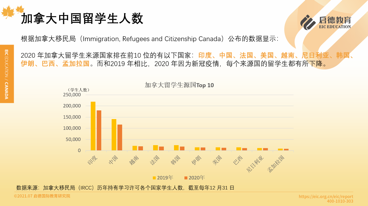 另一組數(shù)據(jù)顯示,2020年中國內(nèi)地學生新增人數(shù)最多的三個省為安大略?。?9.78% )、英屬哥倫比亞省(26.17% )、魁北克?。?.49% )。一方面,安大略省與英屬哥倫比亞省這兩個省份的教育資源非常豐富,有多所世界知名大學讓中國學生選擇;另一方面,多倫多、溫哥華、渥太華等大城市均在這兩個省份,工作機會多,移民政策也相對成熟,對希望留在加拿大發(fā)展的留學生很具吸引力。
