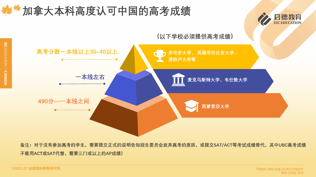 加拿大本科認可中國的高考成績,其中多倫多大學、英屬哥倫比亞大學、滑鐵盧大學等要求高考分數(shù)一本線30-40分以上,麥克馬斯特大學、韋仕敦大學要求一本線左右,西蒙菲莎大學要求490分至一本線之間。沒有參加高考的學生,需要提交正式的說明告知招生委員會放棄高考的原因,或提交SAT/ACT等考試成績替代(其中英屬哥倫比亞大學高考成績不能用ACT或SAT代替,需要三門或以上的AP成績)。