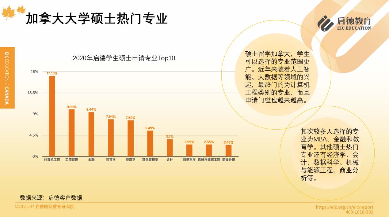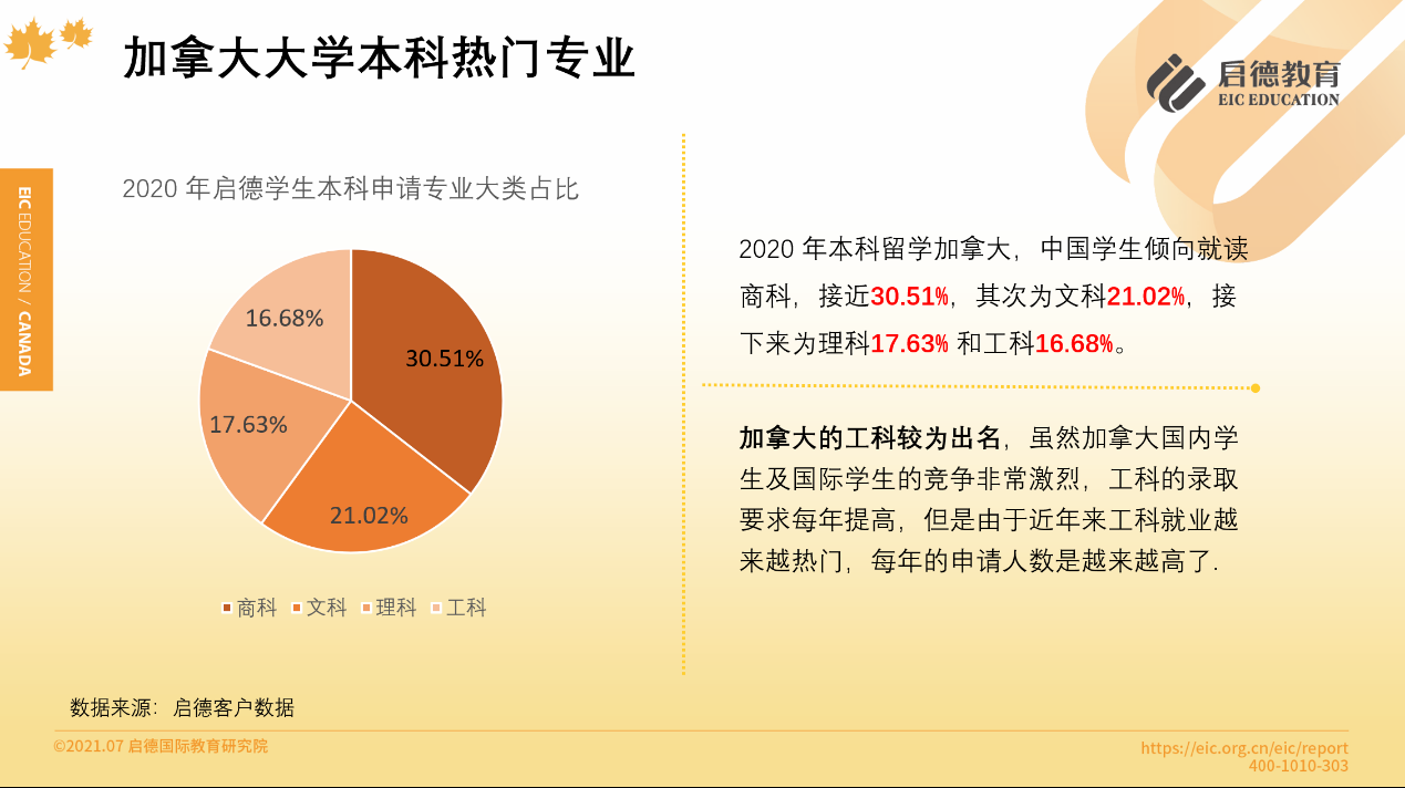 啟德留學客戶服務(wù)數(shù)據(jù)顯示,2020年加拿大本科階段,理工科專業(yè)占比34.31%,商科占比30.51%,文科21.02%,理工科的申請人數(shù)超過了商科。碩士階段選擇最多的專業(yè)是計算機工程(17.13% )、 MBA (9.99% )、金融(9.44% )與教育學(7.94% ),其他碩士熱門專業(yè)還有經(jīng)濟學、會計、數(shù)據(jù)科學、機械與能源工程、商業(yè)分析等。