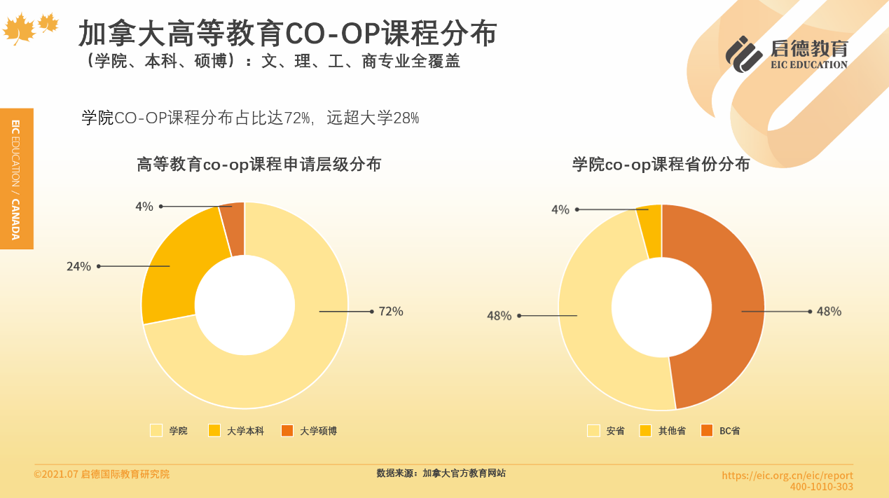 加拿大官方教育網(wǎng)站數(shù)據(jù)顯示,加拿大高等教育普遍開設(shè)覆蓋文、工、理、商全專業(yè)的 Co-op帶薪實習課程,其中學院的 Co-op課程占比最多(72% ),其次是大學本科(24% )與大學碩博(4% )。在學院 Co-op課程的省份分布上,安大略省與英屬哥倫比亞省平分秋色,各占48%。