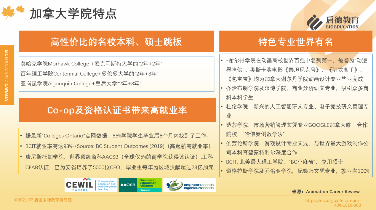 “ Colleges Ontario”官網(wǎng)數(shù)據(jù)顯示,85 %的學院學生畢業(yè)后6個月內(nèi)找到了工作,91%的雇主對學生表示非常滿意。如康尼斯托加學院,擁有世界頂級商科 AACSB與工科 CEAB認證,為安省培養(yǎng)了5000位 CEO,畢業(yè)生每年為區(qū)域貢獻超過23億加元。而奧斯卡獎電影《泰坦尼克號》、《馴龍高手》、《包寶寶》均為加拿大謝爾丹學院動畫設(shè)計專業(yè)畢業(yè)完成。杜倫學院的人工智能專業(yè),道格拉斯學院的配鏡師專業(yè)也是世界有名的特色專業(yè)。