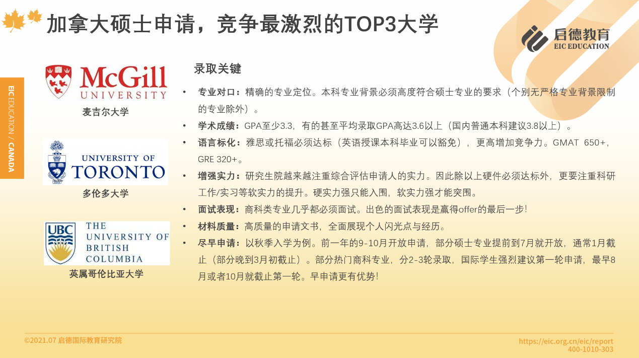 據(jù)啟德留學加拿大項目介紹,加拿大碩士申請競爭最激烈的三所大學為麥吉爾大學、多倫多大學與英屬哥倫比亞大學。申請人 GPA至少達到3.3,有的甚至要求平均錄取 GPA高達3.6以上(國內(nèi)普通本科建議3.8以上);雅思或托福必須達標(英語授課本科專業(yè)可以豁免), GMAT650+, GRE320+;除硬件必須達標外,加拿大名校注重科研、工作 /實習等軟實力的提升;商科類專業(yè)幾乎都必須面試。