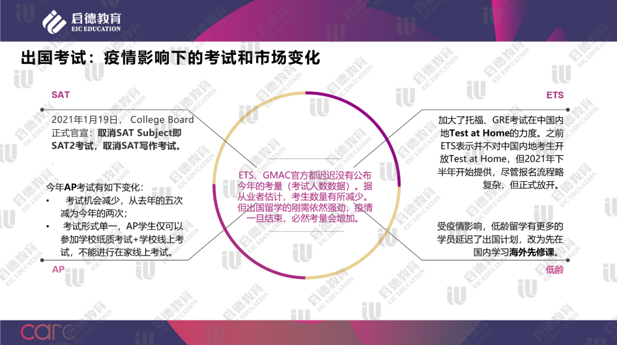與此同時(shí),國(guó)產(chǎn)疫苗被海外多國(guó)認(rèn)可。此外,各種跡象表明,作為最主要的留學(xué)語(yǔ)言,2021年英語(yǔ)考試認(rèn)證已放寬,考點(diǎn)也在增多。除了日本37所知名院校開(kāi)展全英文授課外,韓國(guó)也可用英語(yǔ)成績(jī)遞交申請(qǐng),法國(guó)提供1700個(gè)左右的英文授課課程,荷蘭碩士英語(yǔ)授課覆蓋率為95%,英語(yǔ)普及率在全世界非英語(yǔ)母語(yǔ)國(guó)家中最高。2021年1月19日,College Board正式宣布取消SAT Subject即SAT2考試,取消SAT寫作考試。2021年下半年 ETS對(duì)中國(guó)內(nèi)地考生開(kāi)放Test at Home。同年,BC也在加快在中國(guó)內(nèi)地的雅思機(jī)考考點(diǎn)建設(shè)速度,計(jì)劃2022年將雅思機(jī)考考點(diǎn)覆蓋內(nèi)地四十多個(gè)城市。