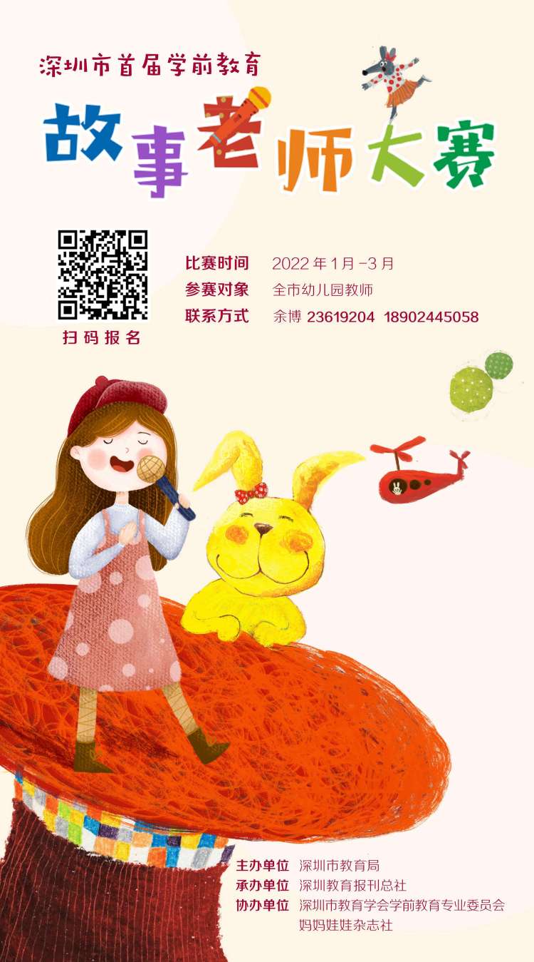 讀特客戶端·深圳新聞網(wǎng)2022年1月12日訊 (記者 陳彬 通訊員 程玉珂)由深圳市教育局主辦,深圳教育報刊總社承辦,深圳市教育學(xué)會學(xué)前教育專業(yè)委員會、媽媽娃娃雜志社協(xié)辦的深圳市首屆學(xué)前教育“故事老師”大賽暨原創(chuàng)繪本大賽將于2022年1-3月舉辦。