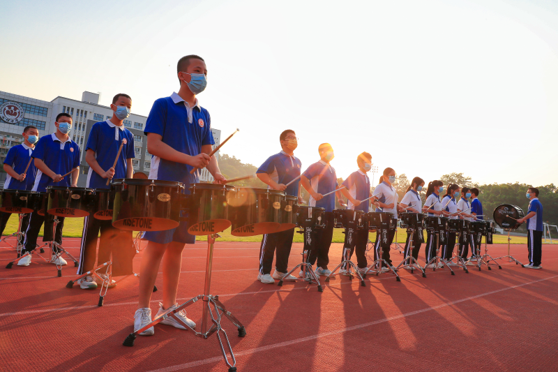 公明中學(xué)打擊樂(lè)團(tuán)用歡快的鼓聲為學(xué)子們加油助威。(公明中學(xué)供圖)
