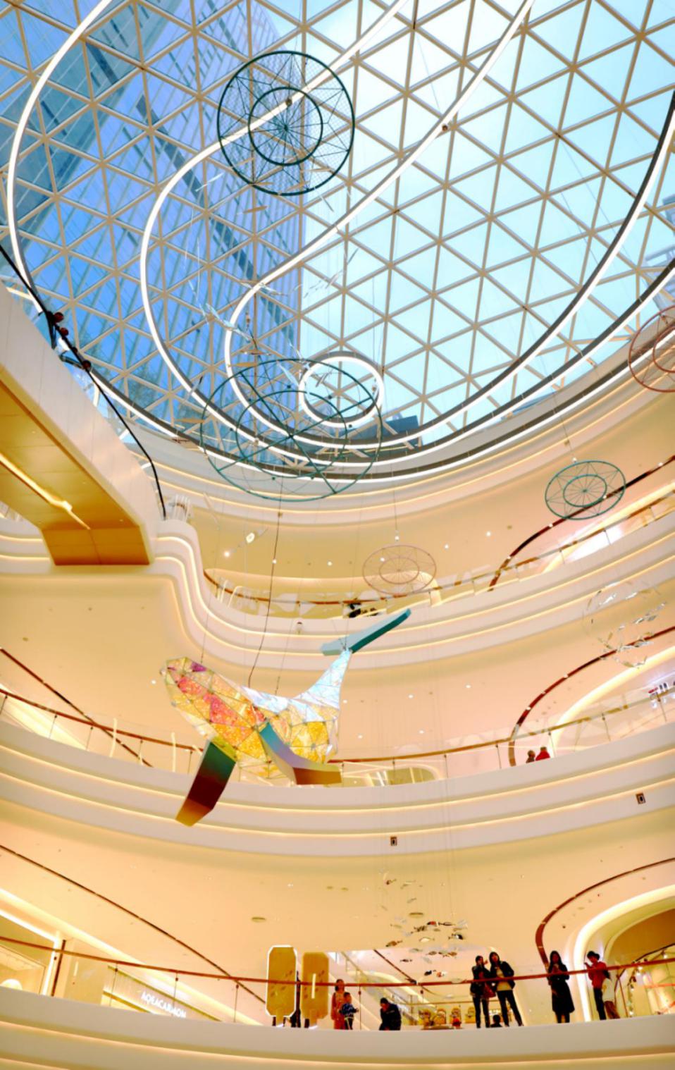 水中庭海之心 LED互動地幕秀,隨時與深海精靈上演親密接觸,內(nèi)設跨層螺旋星語滑梯,讓人們回歸童年的冒險世界;木中庭,“凈化”城市呼吸系統(tǒng)的鮮氧氣泡,向下“生長”的繁茂大樹,如同漫游在森意盎然的自然幻境;花中庭,澆灌“蒲公英”主題跨層挑臺,生長出城市里的秘密花園。同時,打造玻璃之森、室內(nèi)養(yǎng)魚池兩大自然微景觀,將生態(tài)之靈氣納入方寸之間。