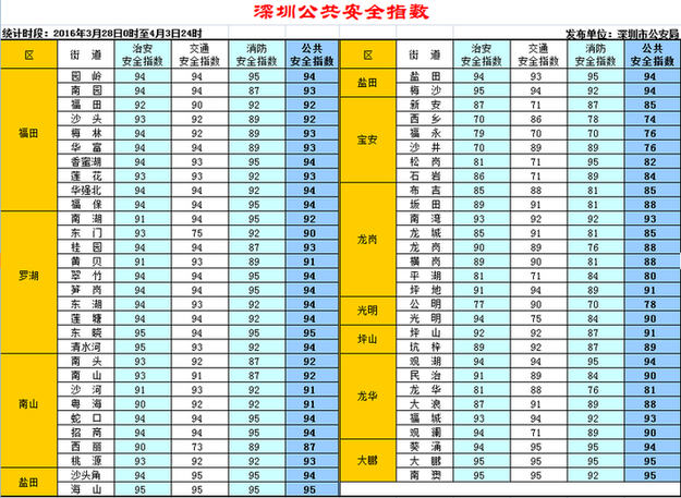 深圳市公安局圍繞市委市政府“城市管理治理年”工作部署要求,借鑒國內(nèi)其他城市的成功做法,將于4月5日開始,每周通過《深圳特區(qū)報(bào)》、《深圳新聞網(wǎng)》、市公安局門戶網(wǎng)站、公安微信、微博,向社會(huì)發(fā)布一次深圳公共安全指數(shù),保障市民群眾知情權(quán)、監(jiān)督權(quán),引導(dǎo)社會(huì)各界廣泛參與 “平安深圳”建設(shè)。