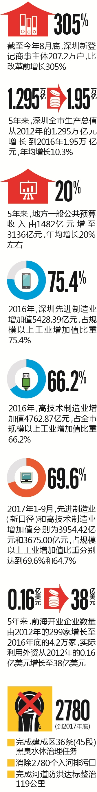 在創(chuàng)新驅(qū)動(dòng)發(fā)展戰(zhàn)略推動(dòng)下,深圳“大眾創(chuàng)業(yè)萬(wàn)眾創(chuàng)新”蓬勃發(fā)展,中外創(chuàng)客匯聚于此。人才與創(chuàng)新為深圳經(jīng)濟(jì)社會(huì)發(fā)展提供源源不斷的活力和潛力。5年來(lái),深圳全市生產(chǎn)總值從2012年的1.295萬(wàn)億元增長(zhǎng)到2016年1.95萬(wàn)億元,年均增長(zhǎng)10.3%;地方一般公共預(yù)算收入由1482億元增至3136億元,年均增長(zhǎng)20%左右。