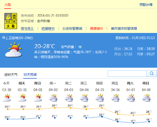 根據(jù)市氣象局發(fā)布消息,本周末到下周初溫暖舒適,無明顯降雨:30日至4月4日多云間晴天,早晚有輕霧,空氣較干燥,30日氣溫20-28℃;5日夜間至6日冷空氣影響,有分散陣雨,北風(fēng)加大,氣溫下降。近期無明顯降水,需加強(qiáng)防火安全管理。