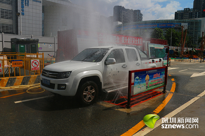 施工單位還利用潛水泵加壓給水管對(duì)車輛進(jìn)行自動(dòng)沖洗,讓施工車輛“清爽出門”,有效防止施工車輛對(duì)城市環(huán)境的污染。同時(shí),沖洗后的污水經(jīng)排水溝回流到三級(jí)沉淀池內(nèi),經(jīng)過(guò)沉淀處理后進(jìn)入清水池,使水資源循環(huán)利用,從而達(dá)到保護(hù)環(huán)境又節(jié)約成本的目的。