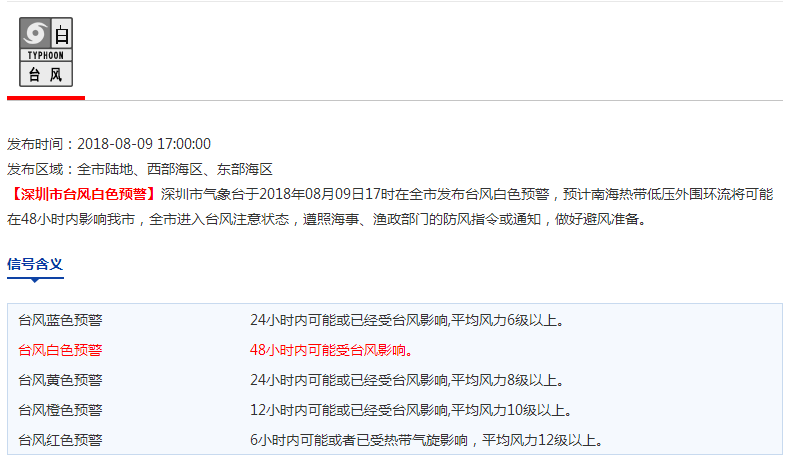 市氣象局于8月9日17時發(fā)布臺風白色預(yù)警信號