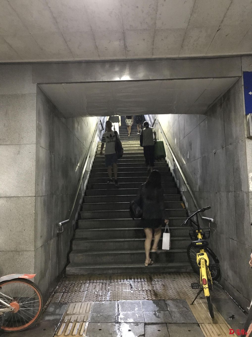 深南大道東門過(guò)街通道,雨天漏水,地板破損,臺(tái)階沒(méi)有坡道,行李箱與自行車得靠人扛