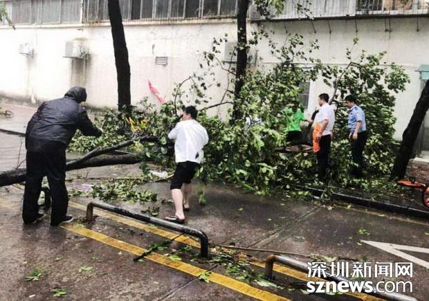 邊檢民警冒雨在執(zhí)勤現(xiàn)場搬挪被強臺風(fēng)刮倒的樹枝