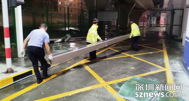 皇崗邊檢站五、六隊的執(zhí)勤民警依舊在室外執(zhí)行監(jiān)護任務(wù),大風(fēng)把他們的身體吹彎了。更危險的時刻來臨,狂風(fēng)將玻璃窗吹倒,玻璃渣碎落一地,執(zhí)勤民警第一時間上前清理,保障車輛通行安全,直到隱患排除后才發(fā)現(xiàn)雙手早已被細碎的玻璃劃得鮮血直流。