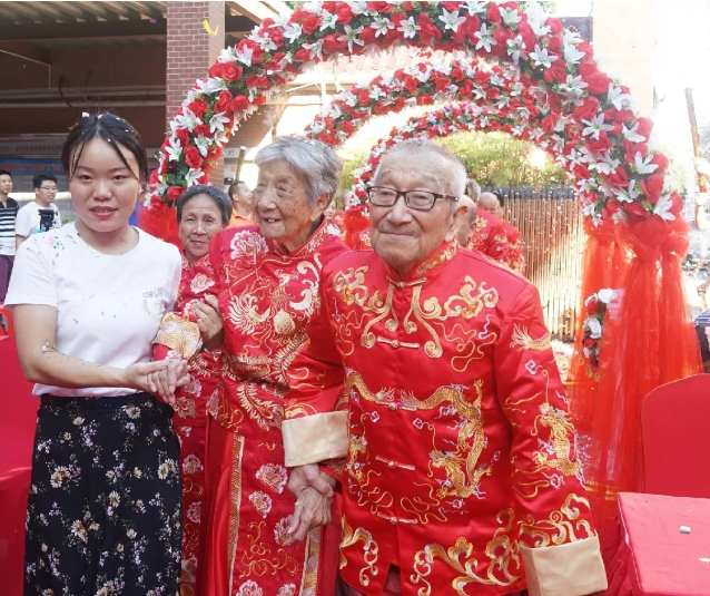 蛇口街道南水社區(qū)居民耿玉璽與王月鳳兩位老人已經(jīng)攜手走過(guò)69年,一直有個(gè)遺憾藏在心里——兩人年輕時(shí)沒(méi)有舉辦過(guò)婚禮,連一張結(jié)婚照片都沒(méi)有。日前,二老的遺憾得到彌補(bǔ),愿望得以實(shí)現(xiàn)。南水社區(qū)黨委以開(kāi)展民生微實(shí)事為契機(jī),為包括耿玉璽與王月鳳夫婦在內(nèi)的社區(qū)15對(duì)老年夫婦舉辦了一場(chǎng)別開(kāi)生面的夕陽(yáng)美集體金婚慶典活動(dòng)。眾多嘉賓及老人的親朋好友、子女兒孫到場(chǎng)見(jiàn)證,獻(xiàn)上掌聲和祝福。